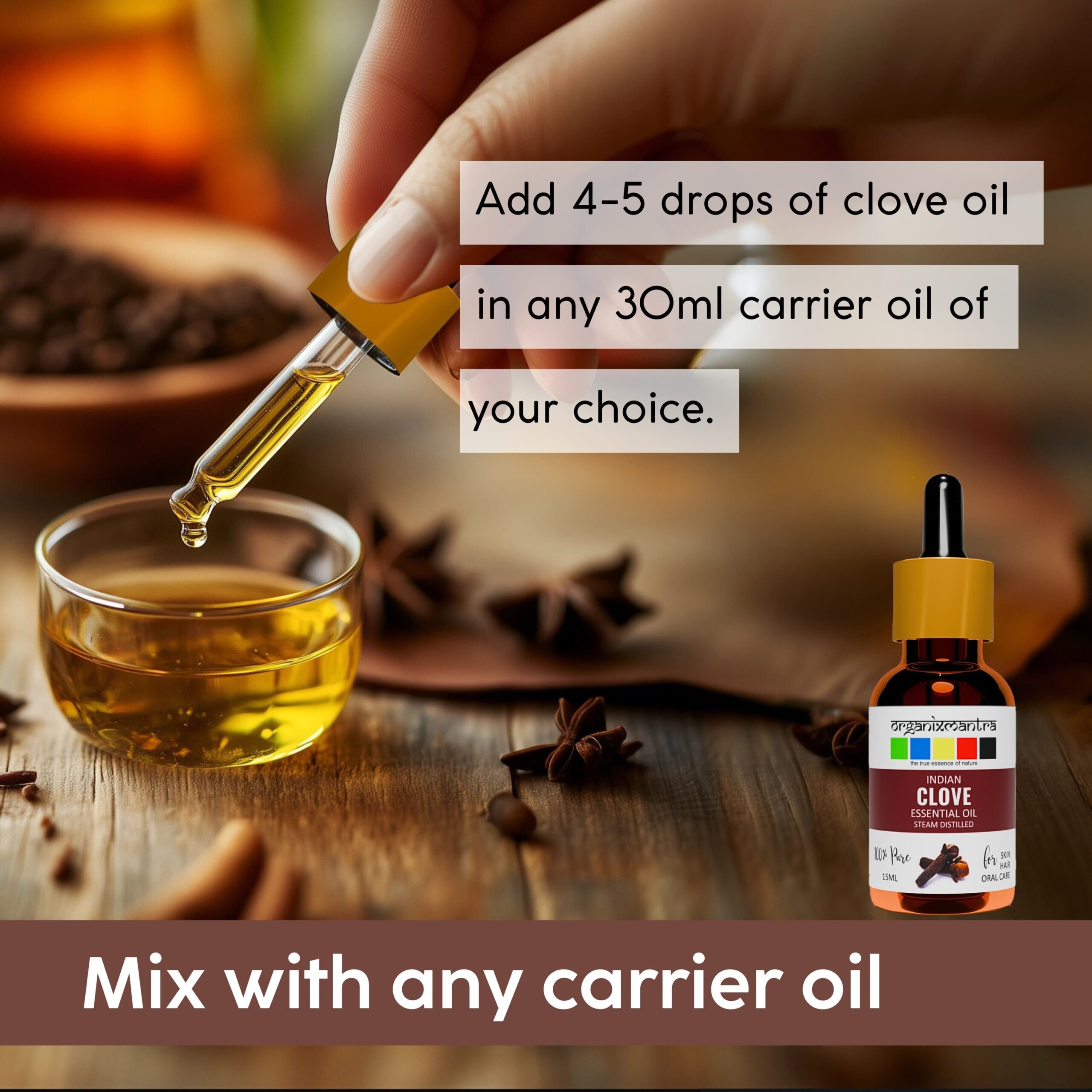 Discover the potent benefits of Organix Mantra Clove Essential Oil, a pure and natural solution crafted to elevate your skincare, haircare, and overall wellness. Sourced from the finest clove buds, this essential oil is known for its rich, warm aroma and powerful properties that have been cherished for centuries. With a high concentration of eugenol, our clove essential oil is a must-have in your wellness routine, providing natural support for glowing skin, healthy hair, and a revitalized mind and body.