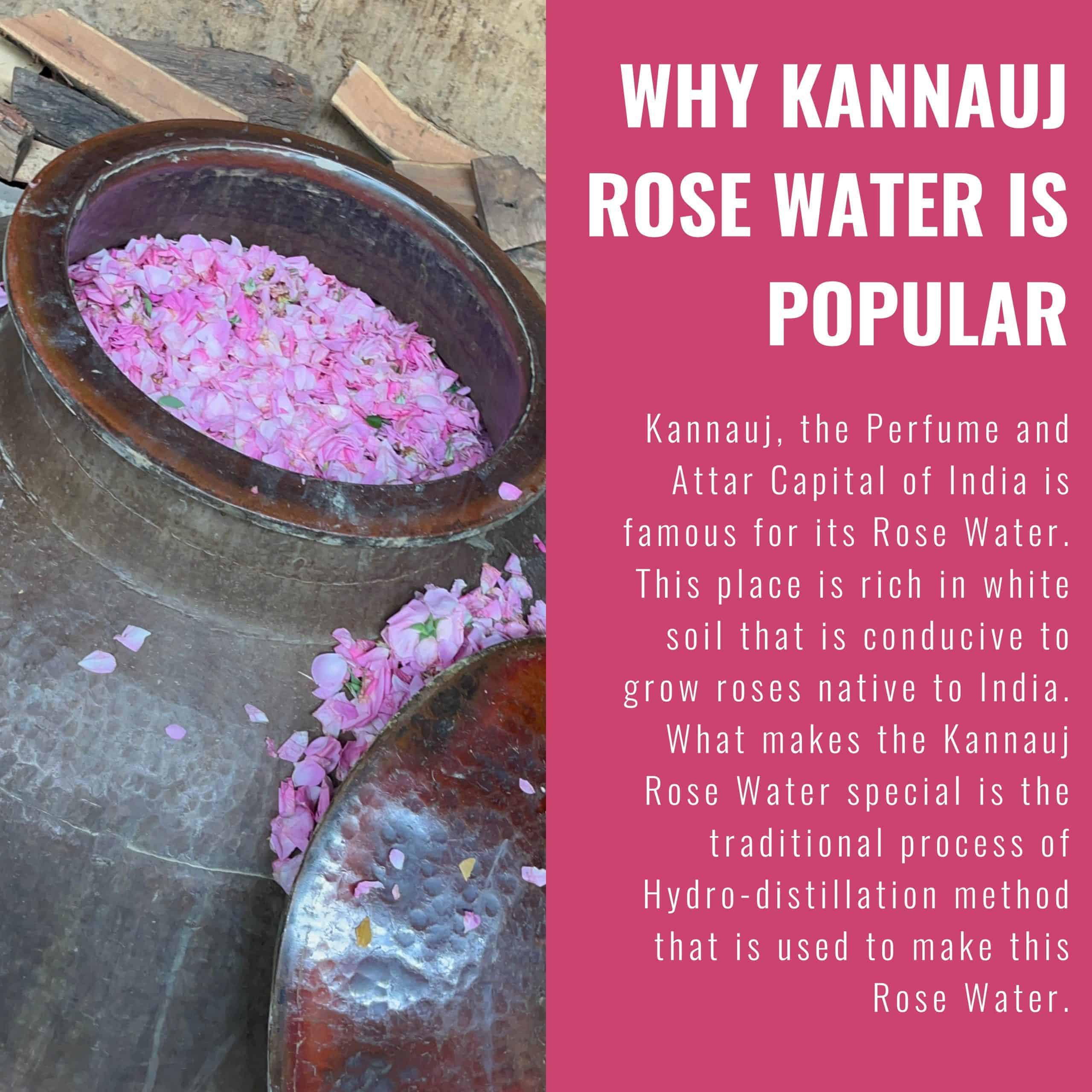 Rose Water is made from fresh handpicked roses of Kannauj by the traditional process of hydro distillation. Kannauj Roses are known for their mood enhancing fragrance, and skin, face and hair care properties.