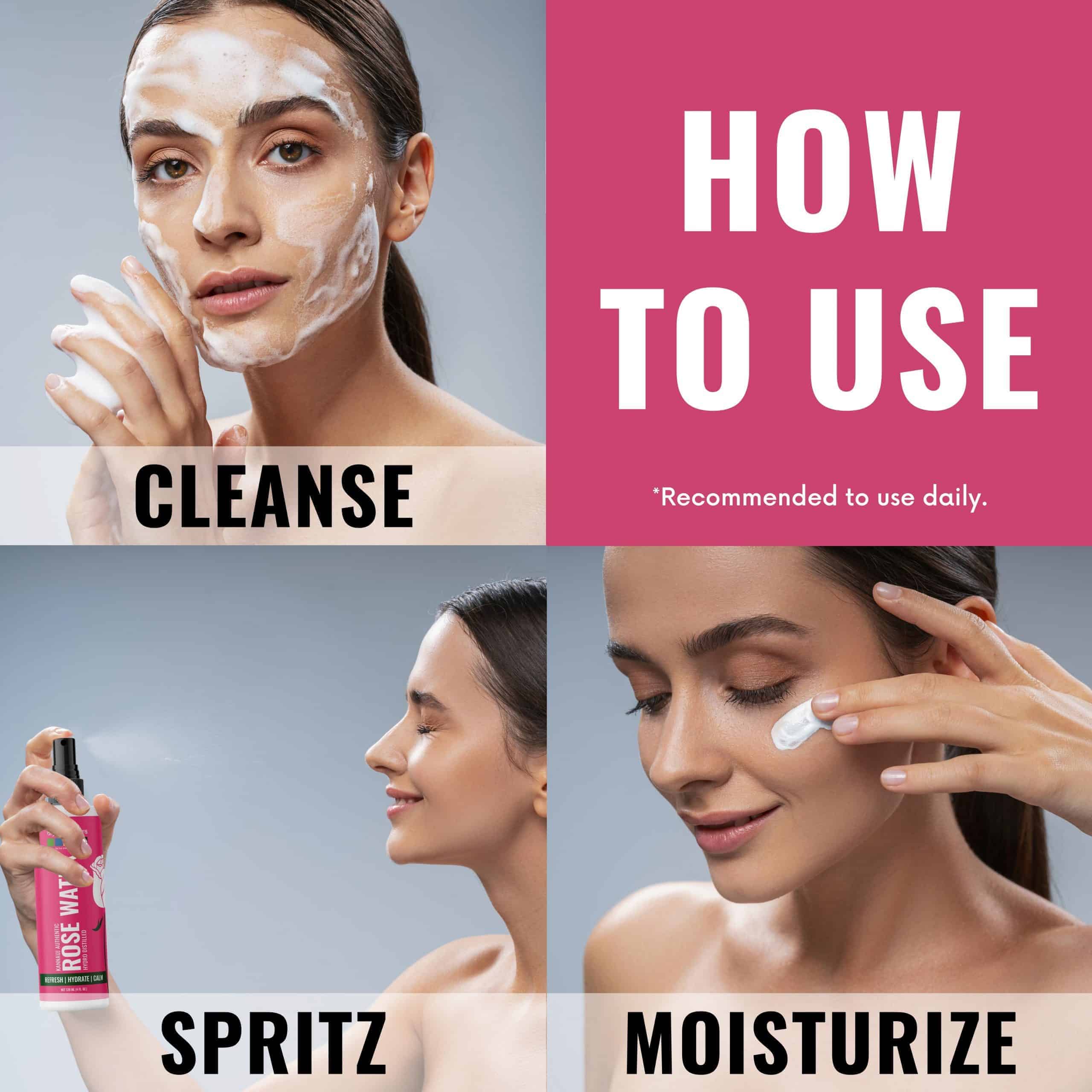 • PREPARES SKIN BEFORE APPLYING MAKEUP – Spritzing Rose Water and allowing it to dry naturally helps in locking in the moisture and tightening the pores before applying any makeup.