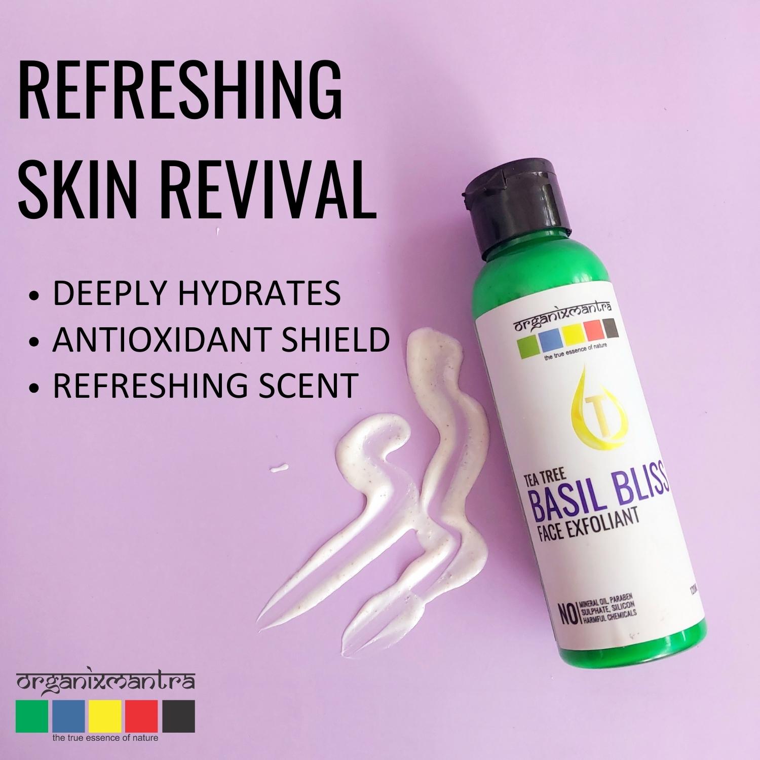 Tea Tree Basil Bliss Face Exfoliator: Combines hydration with gentle exfoliation to reveal your skin’s natural glow and smooth texture.