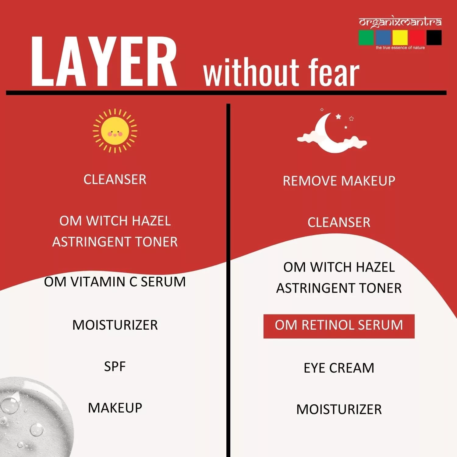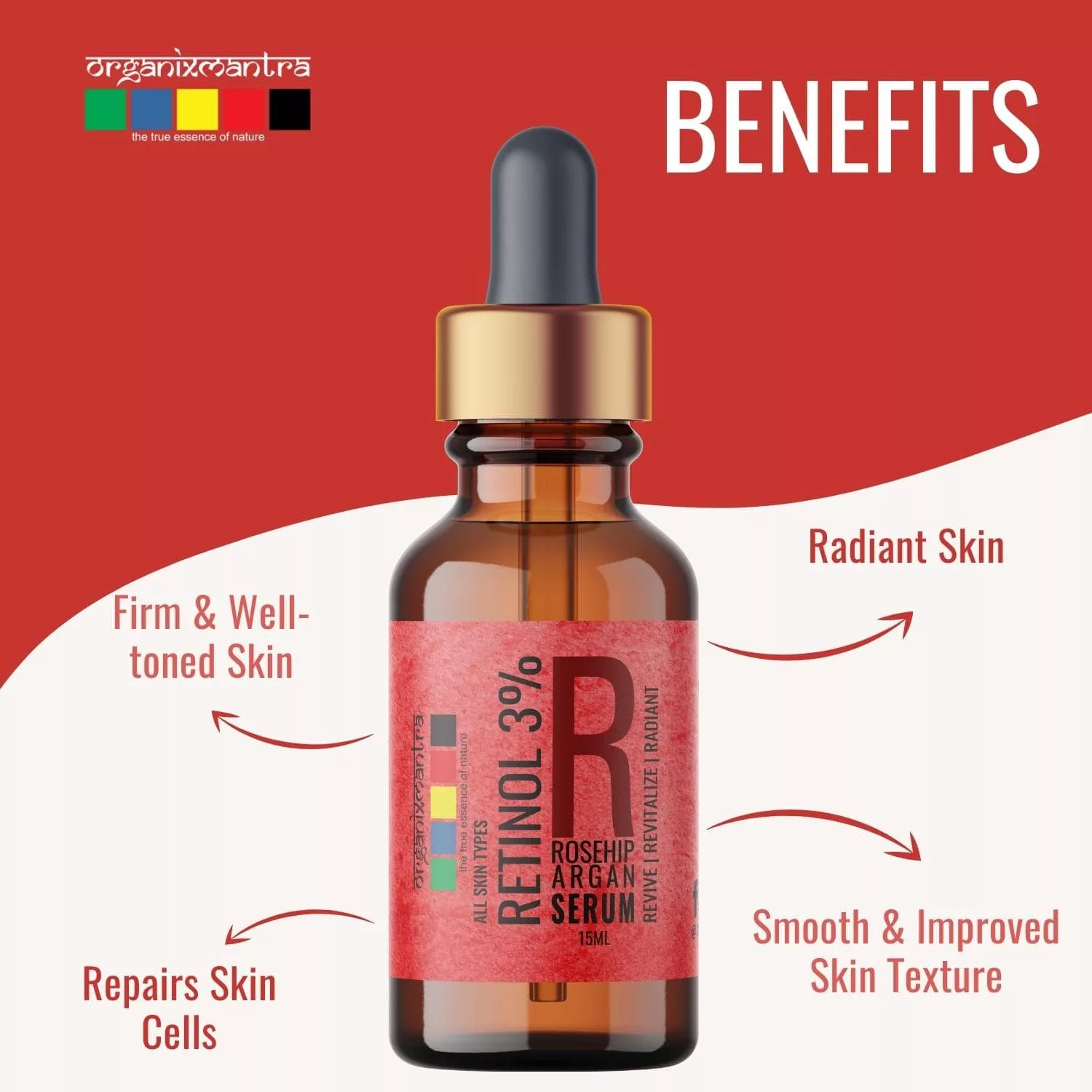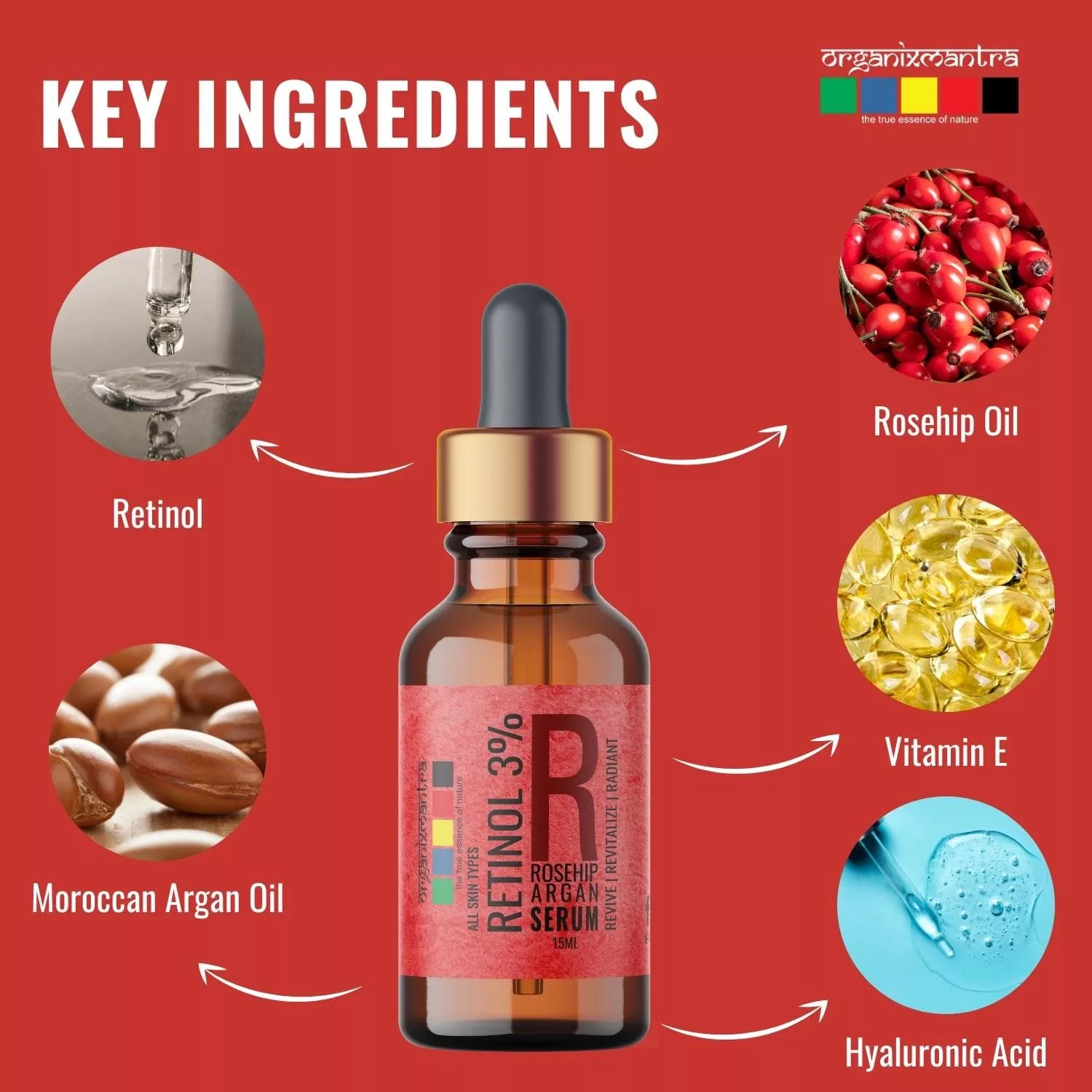 Retinol is a vitamin A derivative that is highly effective in reversing sun damage and signs of aging. Regularly applying Retinol serum is known to aid in cell turnover reduce fine lines, even skin color, improve texture, tighten pores, and stimulate collagen production. Organix Mantra Retinol 3% Serum for face is a balanced blend of Vitamin E, Hyaluronic Acid, Moroccan Argan Oil, and Rosehip Oil.
