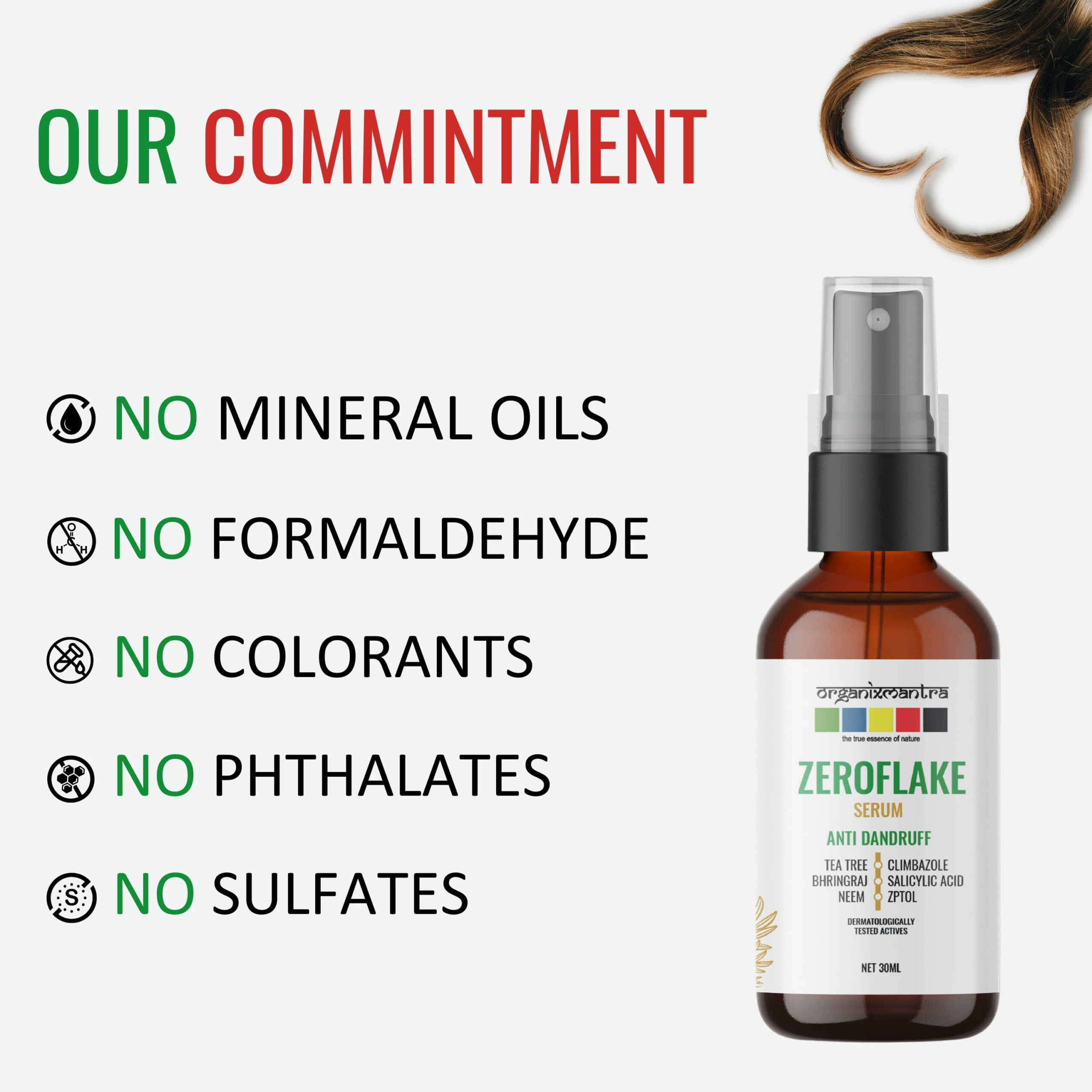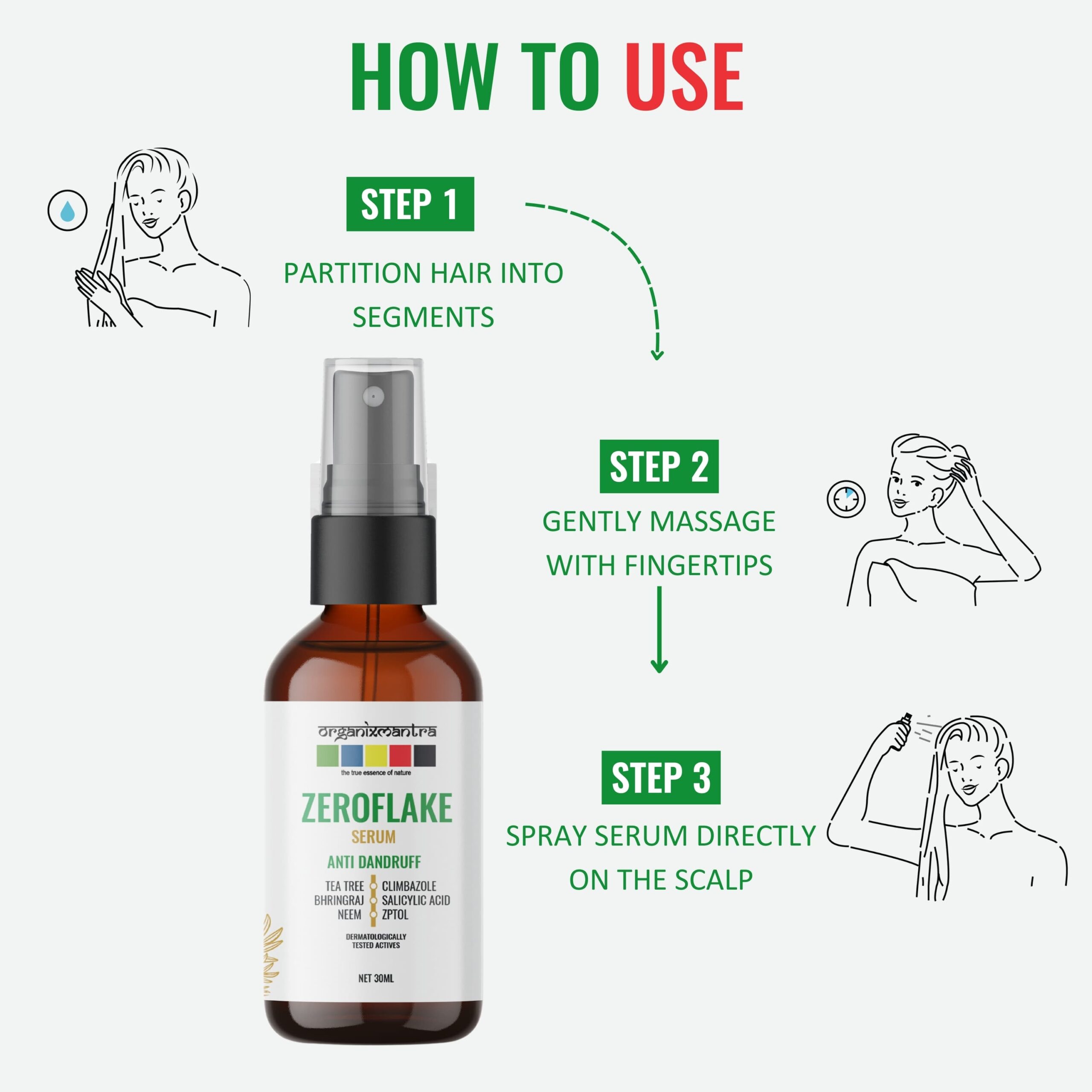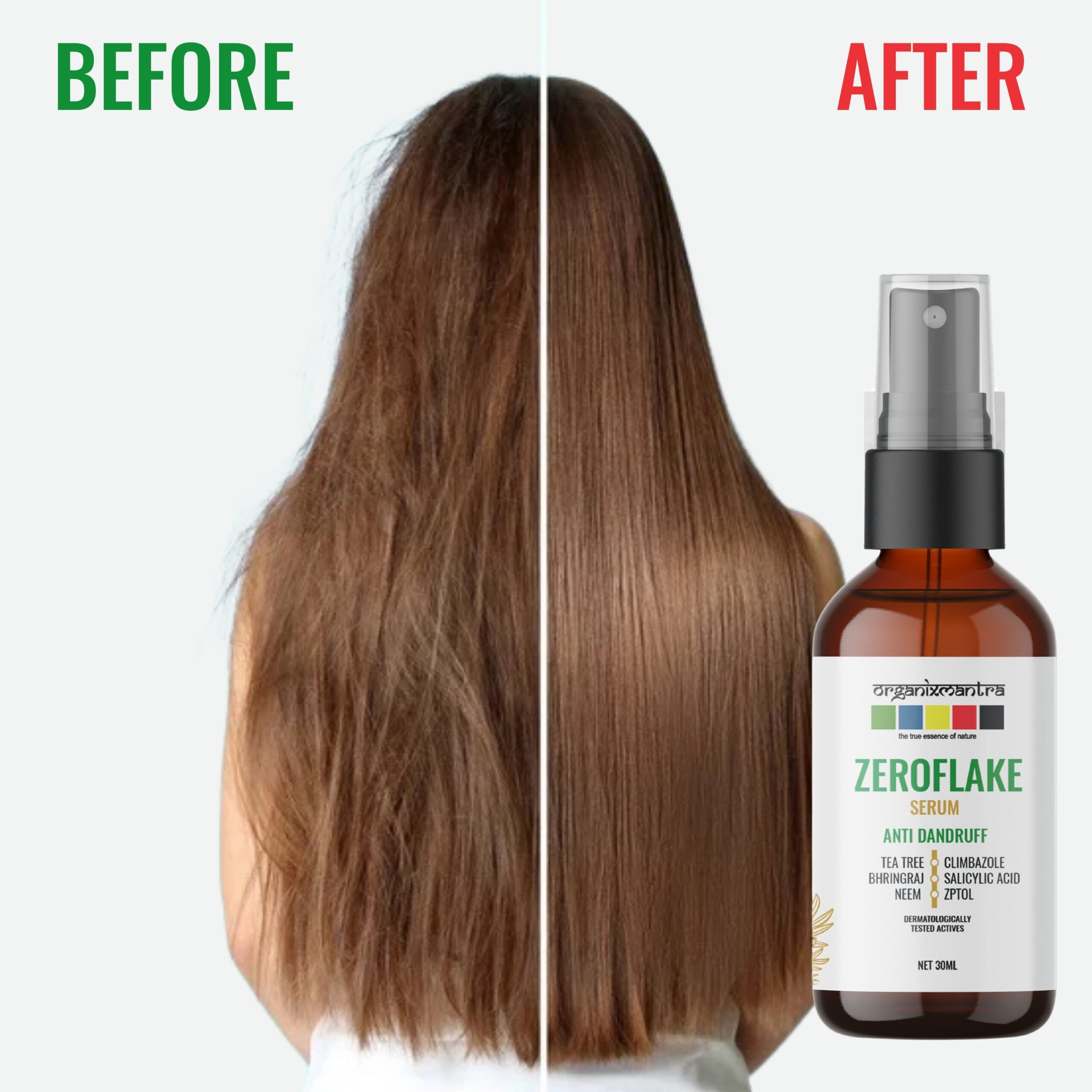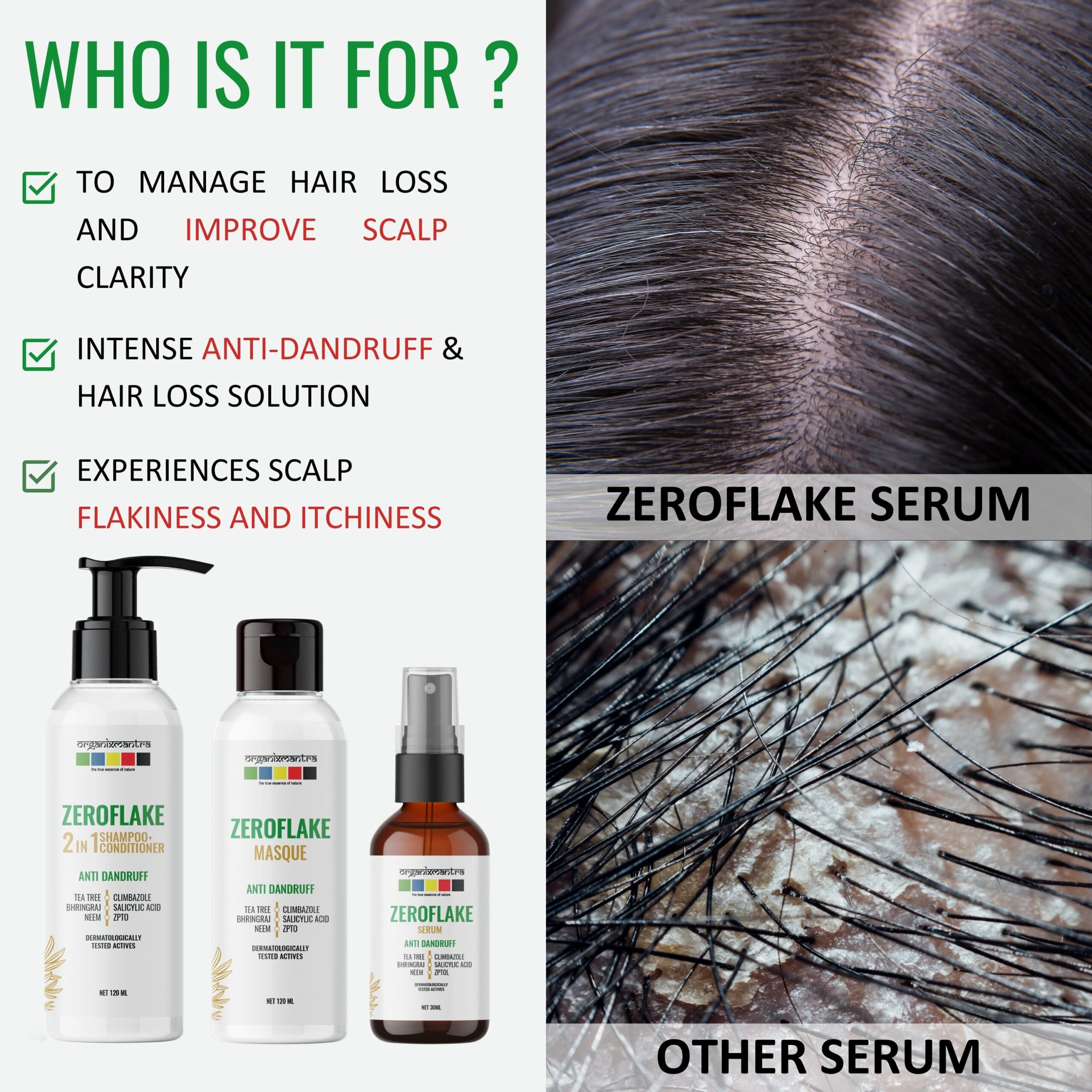 - ADVANCED ANTI-DANDRUFF FORMULA : Organix Mantra ZeroFlake Hair Serum, with Zinc Pyrithione, Climbazole, Salicylic Acid, Tea Tree Oil, Neem Extract, and Bringraj, combats dandruff and soothes, exfoliates, and hydrates for a healthy scalp.